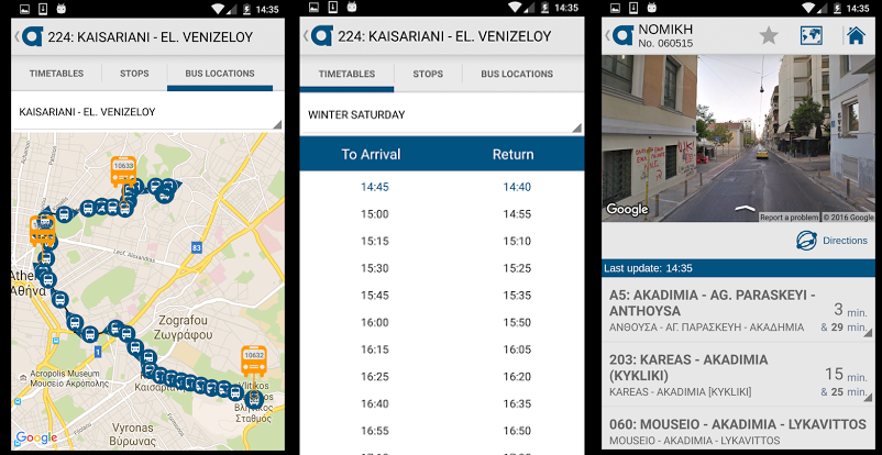 - Για κάθε στάση: χρόνος άφιξης του επόμενου λεωφορείου για κάθε γραμμή που διέρχεται από τη στάση, εμφάνιση της τοποθεσίας της στάσης στο Google Street View