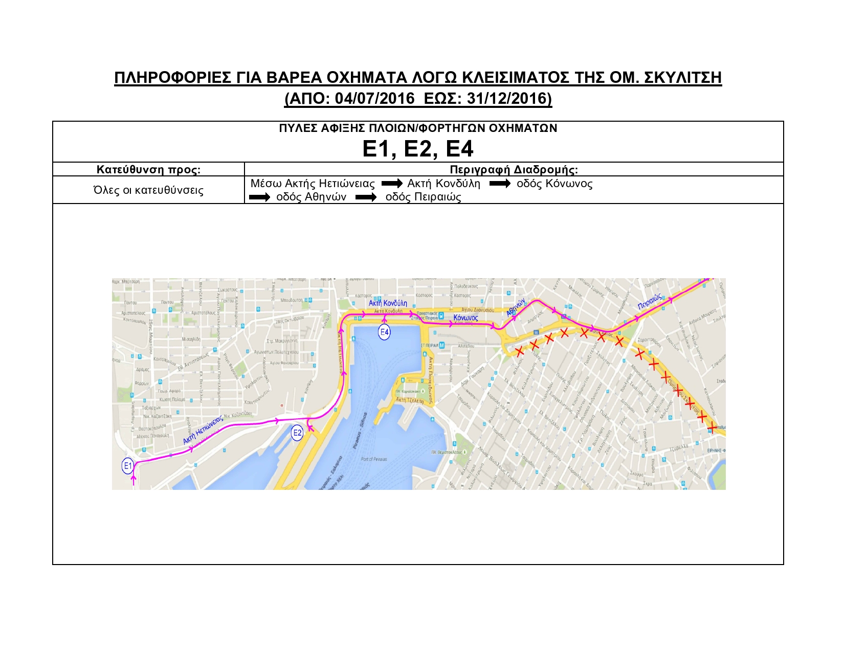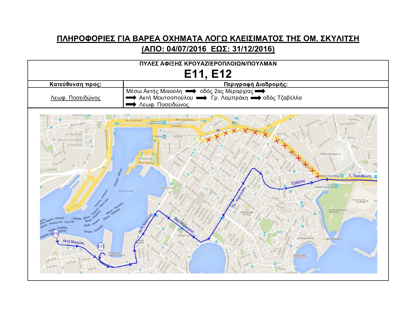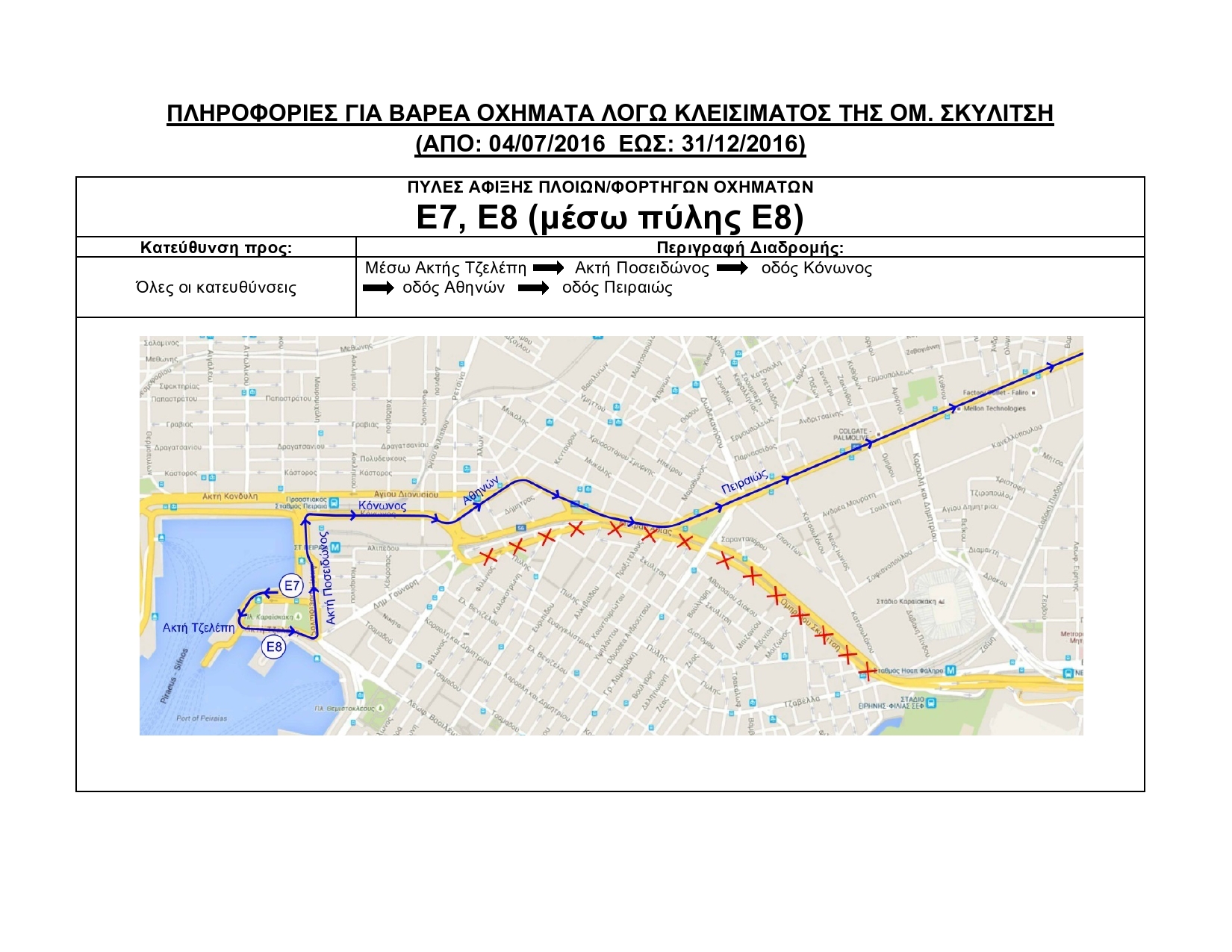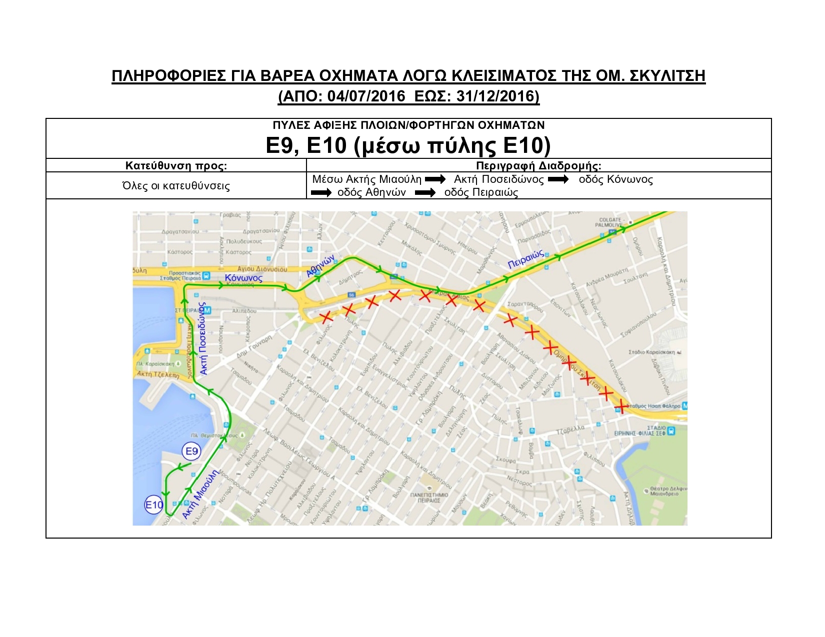 Ακτή Ποσειδώνος → οδός Κόνωνος → οδός Αθηνών → οδός Πειραιώς. - Μέσω Ακτής Μιαούλη → οδός 2ας Μεραρχίας → Ακτή Μουτσοπούλου → Γρ. Λαμπράκη → οδός Πειραιώςή για τα βαρέα οχήματα