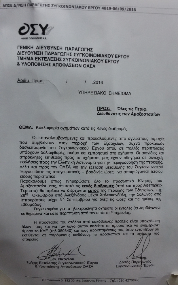 Το υπηρεσιακό σημείωμα, το οποίο έχει ημερομηνία 6/9/2016 και υπογράφεται από τον Τομεάρχη Εκτέλεσης Συγκοινωνιακού Έργου καθώς και από το Διευθυντή Παραγωγής Συγκοινωνιακού Έργου της ΟΣΥ και έχει ως αποδέκτες όλες τις περιφερειακές διευθύνσεις των αμαξοστασίων Λεωφορείων και Τρόλεϊ της Αθήνας, καλεί τους διευθυντές να ενημερώσουν το προσωπικό κίνησης ώστε τα Λεωφορεία να μην διέρχονται μέσα από την περιοχή των Εξαρχείων κατά τις κενές διαδρομές (από το αμαξοστάσιο προς τις αφετηρίες και από τα τέρματα προς το αμαξοστάσιο).