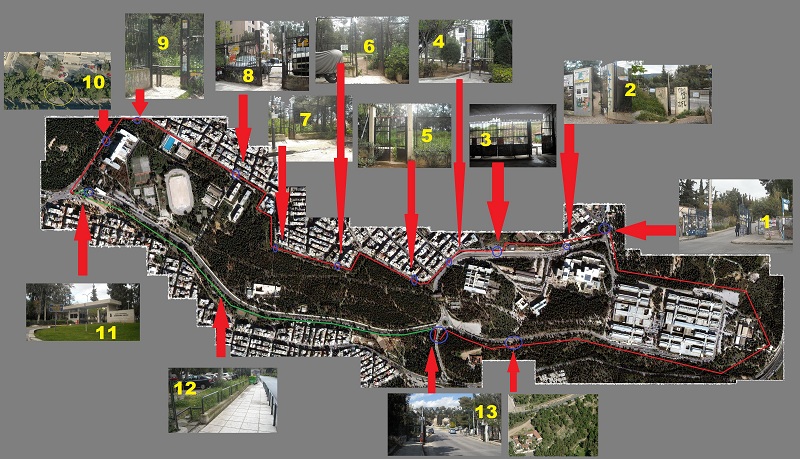 - -Νούμερο 12 στον χάρτη- Η νότια πλευρά της Πανεπιστημιούπολης που συνορεύει με τα Ιλίσια και έως την πύλη της Καισαριανής, είναι προσβάσιμη σε όλο το μήκος της για τους πεζούς καθώς δεν περικλείεται από φράκτη. Αντίθετα, η πλευρά που συνορεύει με την Καισαριανή περικλείεται από φράκτη. (Προβολή στον χάρτη/Πρόσβαση από την τοποθεσία μου)