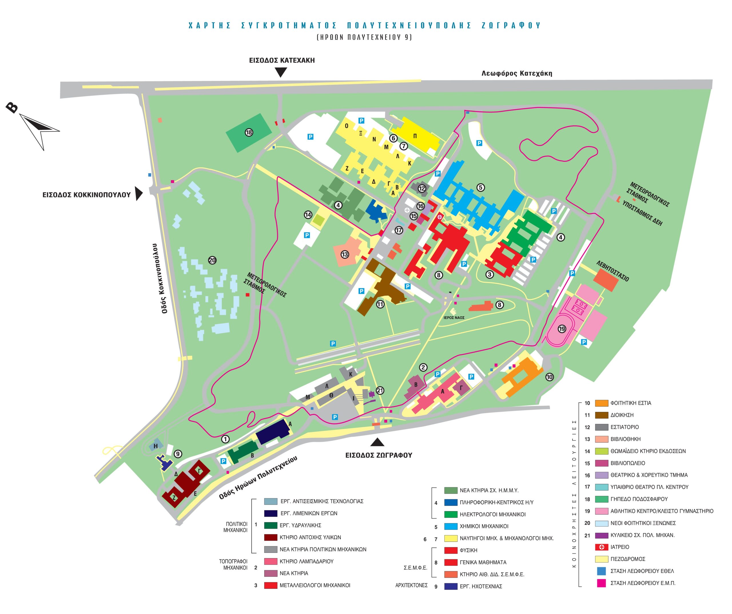 Παρατηρώντας τον χάρτη της Πανεπιστημιούπολης Ζωγράφου, ξεκινώντας από δυτικά προς τα ανατολικά (από αριστερά προς τα δεξιά) βλέπουμε ότι σήμερα στην Πανεπιστημιούπολη στεγάζονται: