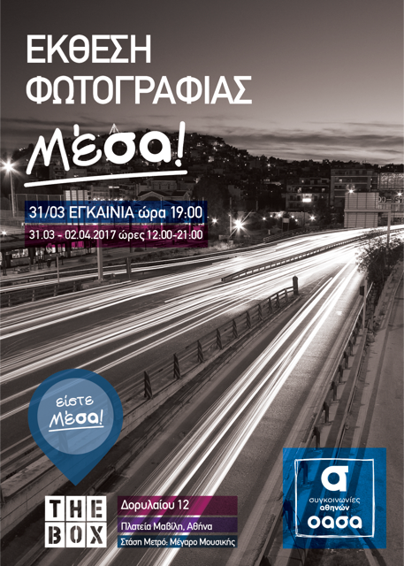 Με την ολοκλήρωση του διαγωνισμού ο Οργανισμός Αστικών Συγκοινωνιών Αθηνών εγκαινιάζει την Έκθεση Φωτογραφίας «Μέσα», την Παρασκευή 31 Μαρτίου, στις 19:00, στο The Box – Athens (Δορυλαίου 12, Πλατεία Μαβίλη) και προσκαλεί τους συμμετέχοντες στον διαγωνισμό, τους φίλους τους και το κοινό να επισκεφθούν την Έκθεση.