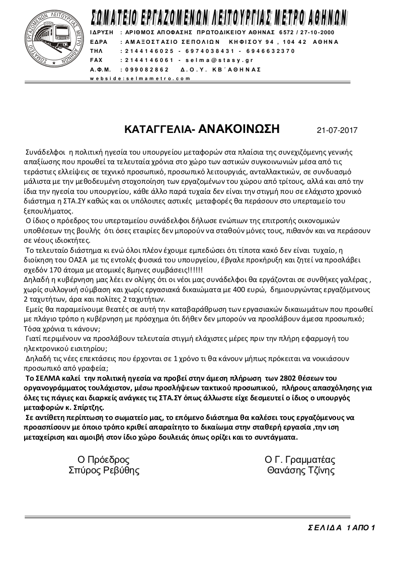 Σε καταγγελία-ανακοίνωση του σωματείου, οι εργαζόμενοι καταγγέλουν πως οι προσλήψεις των 166 εργαζομένων που θα εργαστούν με 8μηνες συμβάσεις είναι στα πλαίσια της συνεχιζόμενης γενικής απαξίωσης των αστικών συγκοινωνιών που τα τελευταία χρόνια προωθεί η πολιτική ηγεσία που υπουργείου Μεταφορών.