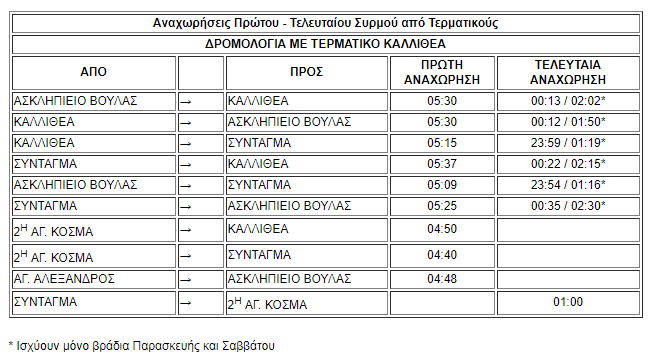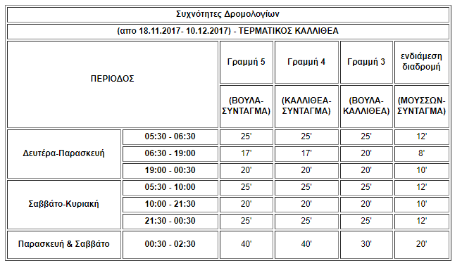 Τα πρώτα και τελευταία δρομολόγια και οι συχνότητες δρομολογίων από τις 18 Νοεμβρίου ως τις 10 Δεκεμβρίου: