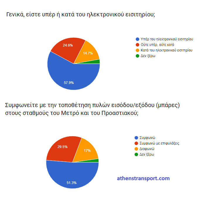 - Το 57,9% είναι υπέρ του ηλεκτρονικού εισιτηρίου, το 51,3% συμφωνεί με τις μπάρες στους σταθμούς Μετρό. 77%: Έγινε κακή διαχείριση της μετάβασης στο ηλεκτρονικό εισιτήριο. 68.2%: Το ηλεκτρονικό εισιτήριο θα μειώσει την εισιτηριοδιαφυγή.