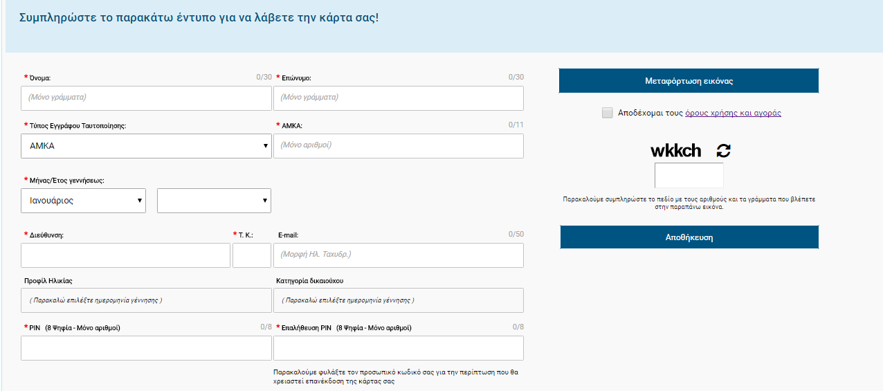 Στη σελίδα της αίτησης, συμπληρώνετε τα στοιχεία σας (Ονοματεπώνυμο, διεύθυνση, ΑΜΚΑ για Έλληνες πολίτες, αριθμός διαβατηρίου για ξένους, ημερομηνία γέννησης, 8ψήφιο PIN – απαραίτητο για επανέκδοση κάρτας).