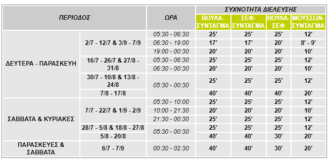 - Από 23 Ιουλίου έως 14 Αυγούστου: Δρομολόγια ανά 10,5′ τις καθημερινές και ανά 12,5′ τα Σαββατοκύριακα