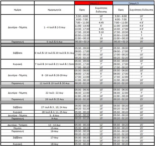 • Από 22 Ιουλίου έως και Τετάρτη 14 Αυγούστου: Δρομολόγια ανά 10,5′ τις καθημερινές και ανά 12,5′ τα Σαββατοκύριακα