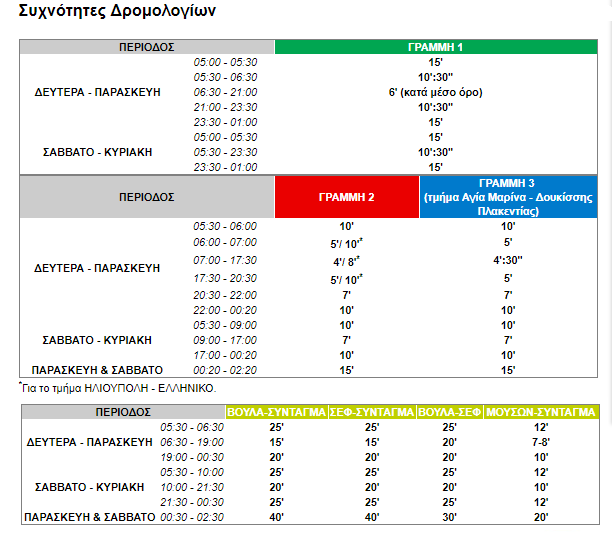 Στη γραμμή 2 του Μετρό, μεταξύ 7:00 – 11:00 οι συρμοί φέτος πρέπει να διέρχονται ανά 4’45” όταν πέρυσι η συχνότητα ήταν ανά 4′. Μεταξύ 11:00 – 13:30 ανά 5′ όταν πέρυσι η συχνότητα ήταν επίσης ανά 4′, μεταξύ 13:30 – 17:30 ανά 4’15” έναντι 4′ πέρυσι και μεταξύ 17:30 – 20:30 ανά 5’10” έναντι 5′ πέρυσι.