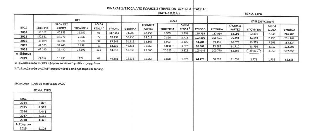 Παρόμοια η εικόνα στην ΣΤΑΣΥ (μετρό, ΗΣΑΠ, τραμ), όπου το 2018 τα έσοδα από πωλήσεις υπηρεσιών ανήλθαν σε 130,04 εκατ. ευρώ από 90,364 εκατ. ευρώ ένα χρόνο πριν. Το 2014 όμως τα έσοδα της ΣΤΑΣΥ έφταναν τα 129,739 εκατ. ευρώ, άπιαστο ποσό για σήμερα. Για το 2019 η μείωση των εσόδων πρέπει να θεωρείται δεδομένη αφού το α’ εξάμηνο τα έσοδα έφτασαν τα 44,773 εκατ. ευρώ.