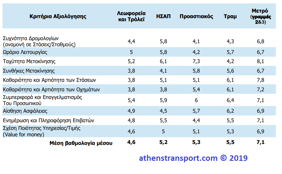 Όπως κάθε χρονιά, το Μετρό (γραμμές 2 & 3) συγκέντρωσε το μεγαλύτερο μέσο όρο βαθμολογίας (7,1) ανάμεσα σε όλα τα μέσα. Ακολούθησε με διαφορά το Τραμ (5,5), ο Προαστιακός (5,3), ο Ηλεκτρικός Σιδηρόδρομος (5,2) ενώ τη χαμηλότερη βαθμολογία και φέτος συγκέντρωσαν τα Λεωφορεία και Τρόλεϊ (4,6).