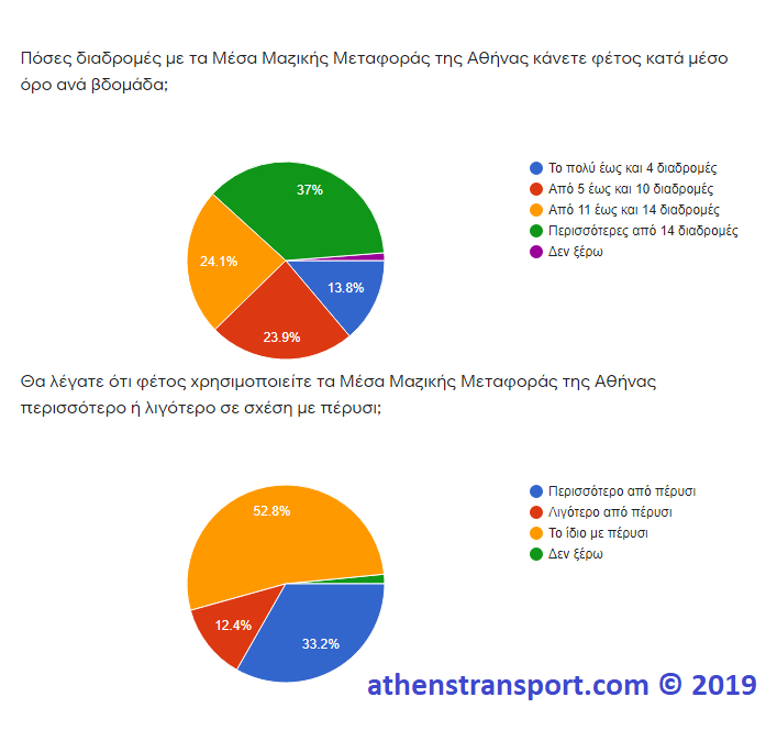 Λίγοι περισσότεροι από τους μισούς συμμετέχοντες (52,8%) απάντησαν πως φέτος χρησιμοποιούν τα Μέσα Μαζικής Μεταφοράς της Αθήνας το ίδιο συχνά σε σχέση με πέρυσι. Το 33,2% απάντησε πως τα χρησιμοποιεί περισσότερο από πέρυσι και το 12,4% λιγότερο από πέρυσι.
