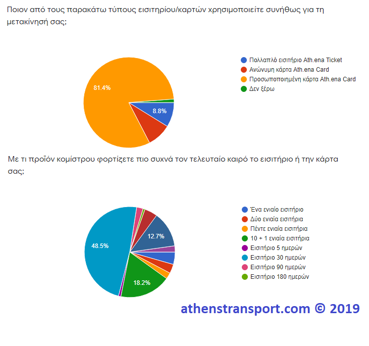 Τέσσερις στους 5, το 81,4% (από 74,9% πέρυσι) απάντησαν πως χρησιμοποιούν προσωποποιημένη κάρτα Ath.ena Card για τις μετακινήσεις τους. Το 8,8% (από 13,7% πέρυσι) χρησιμοποιεί πολλαπλό εισιτήριο Ath.ena Ticket και το 8,6% ανώνυμη κάρτα Ath.ena Card.
