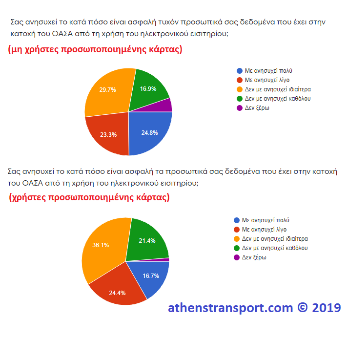 Οι συμμετέχοντες στην έρευνα ρωτήθηκαν για το αν τους ανησυχεί πόσο ασφαλή είναι τα προσωπικά τους δεδομένα που έχει (ή τυχόν έχει) στην κατοχή του ο ΟΑΣΑ από τη χρήση του ηλεκτρονικού εισιτηρίου.