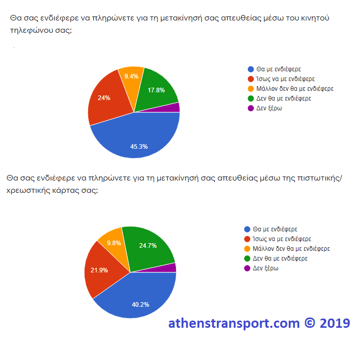 Το 62,1% απάντησε πως θα ενδιαφερόταν για πληρωμή της μετακίνησης απευθείας με πιστωτική ή χρεωστική κάρτα. Το 34,5% δεν θα ενδιαφερόταν ή μάλλον δεν θα ενδιαφερόταν και το 3,4% δεν ξέρει.