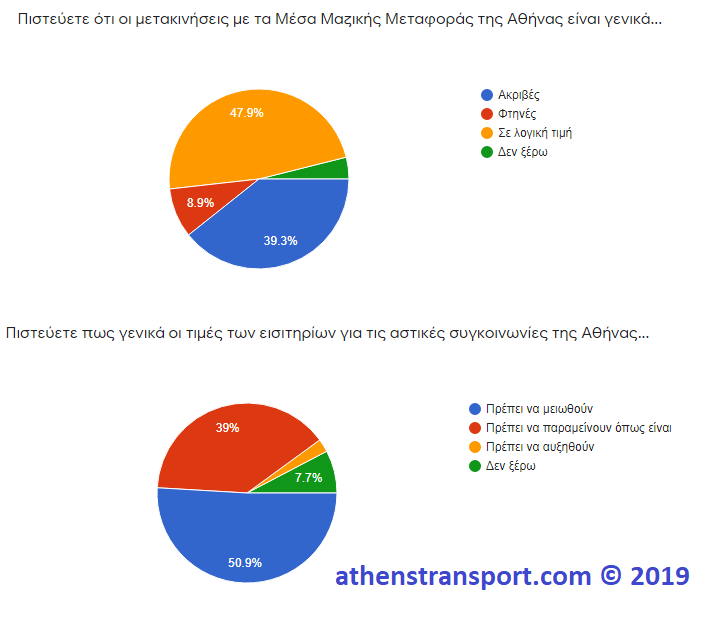 Το 50,9% (από 53,1% πέρυσι) όσων απάντησαν θεωρεί πως οι τιμές των εισιτηρίων στις αστικές συγκοινωνίες της Αθήνας πρέπει να μειωθούν. Το 39% πως πρέπει να παραμείνουν όπως είναι ενώ το 2,4% πως πρέπει να αυξηθούν. Το 7,7% απάντησε πως δεν γνωρίζει.