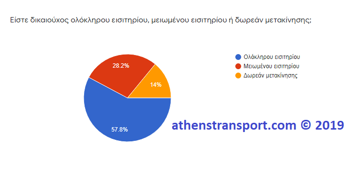 Το 57,8% όσων απάντησαν δήλωσαν δικαιούχοι ολόκληρου εισιτηρίου. Το 28,2% δικαιούχοι μειωμένου εισιτηρίου και το 14% δικαιούχοι δωρεάν μετακίνησης.