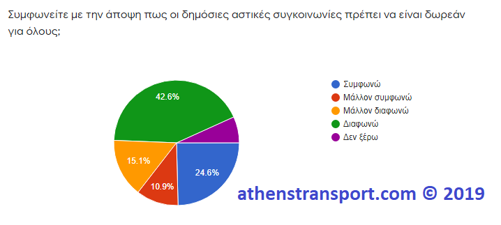 Το 57,7% (από 61% πέρυσι) διαφωνεί ή μάλλον διαφωνεί με την άποψη πως οι δημόσιες αστικές συγκοινωνίες πρέπει να είναι δωρεάν για όλους. Ποσοστό  35,5% (από 33,2% πέρυσι) συμφωνεί ή μάλλον συμφωνεί με την άποψη αυτή, ενώ ποσοστό 6,8% απάντησε πως δεν ξέρει.