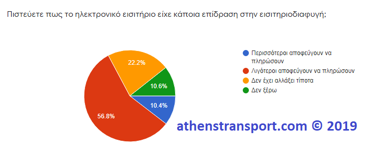 Το 56,8% πιστεύει πως μετά την εφαρμογή του ηλεκτρονικού εισιτηρίου λιγότεροι επιβάτες αποφεύγουν να πληρώσουν, ενώ το 10,4% πως περισσότεροι αποφεύγουν να πληρώσουν. Το 22,2% πιστεύει πως δεν έχει αλλάξει τίποτα ενώ το 10,6% δεν ξέρει.