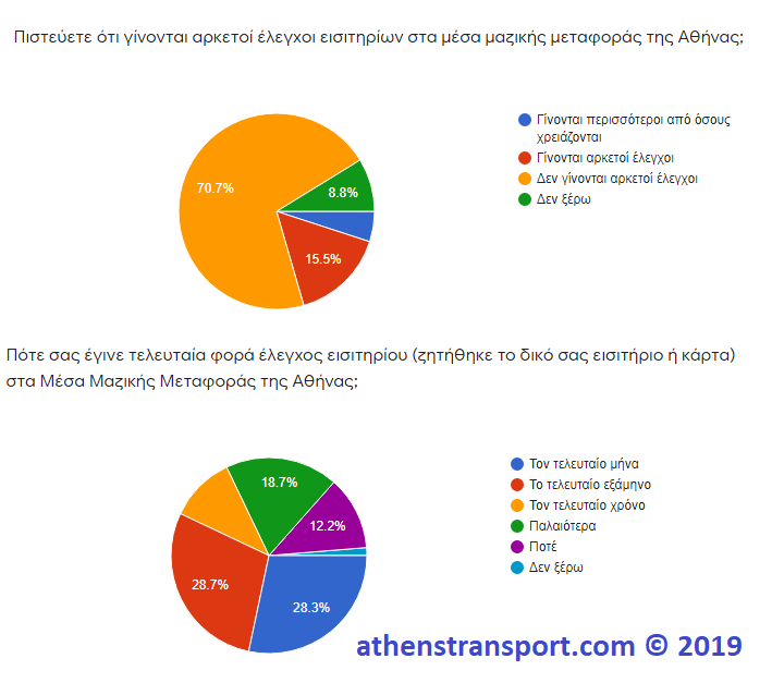 Το 70,7% όσων απάντησαν πιστεύει πως δεν γίνονται αρκετοί έλεγχοι εισιτηρίων στα μέσα μαζικής μεταφοράς της Αθήνας. Το 15,5% (από 12,8% πέρυσι) πιστεύει πως γίνονται αρκετοί έλεγχοι ενώ το 5% πως γίνονται περισσότεροι έλεγχοι από όσους χρειάζονται.