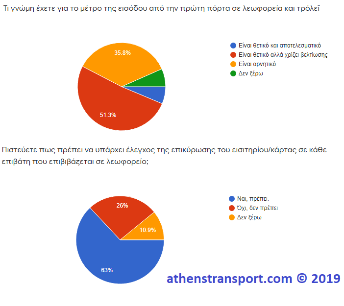 Όσον αφορά το μέτρο της εισόδου από την πρώτη πόρτα σε λεωφορεία και τρόλεϊ, η πλειοψηφία (51,3%) πιστεύει πως είναι θετικό μέτρο αλλά χρίζει βελτίωσης. Το 35,8% πιστεύει πως είναι αρνητικό μέτρο ενώ το 6,3% πως είναι θετικό και αποτελεσματικό.