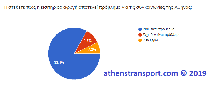 Η συντριπτική πλειοψηφία (83,1%) πιστεύει πως η εισιτηριοδιαφυγή αποτελεί πρόβλημα για τις συγκοινωνίες της Αθήνας. Το 9,7% (από 10,8% πέρυσι) πιστεύει πως δεν είναι πρόβλημα ενώ το 7,2% δεν ξέρει.