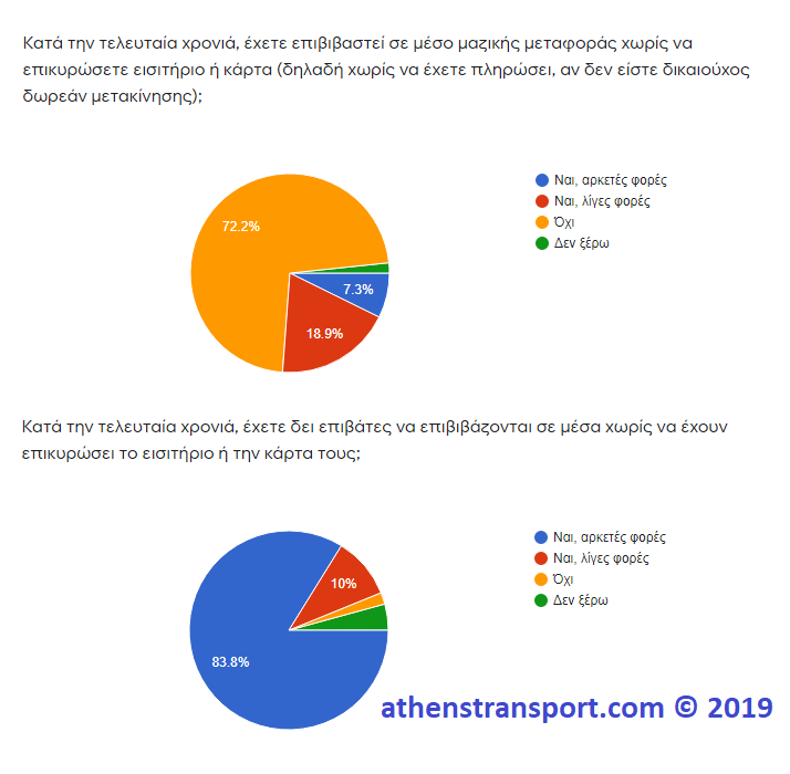 Το 72,2% (από 68,6% πέρυσι) απάντησε πως κατά την τελευταία χρονιά δεν έχει ποτέ επιβιβαστεί σε μέσο μαζικής μεταφοράς χωρίς να έχει πληρώσει (αν δεν είναι δικαιούχος δωρεάν μετακίνησης). Όμως, σχεδόν ένας στους πέντε (18,9%) απάντησε πως το έχει κάνει λίγες φορές και το 7,3% (από 8,4% πέρυσι) το έχει κάνει αρκετές φορές.