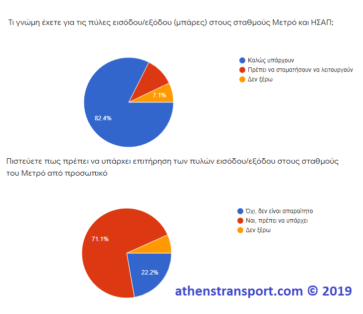 Το 82,4% πιστεύει πως οι καλώς υπάρχουν οι πύλες εισόδου/εξόδου στους σταθμούς Μετρό και ΗΣΑΠ. Το 10,5% (από 12,7% πέρυσι) θέλει να σταματήσουν να λειτουργούν ενώ το 7,1% δεν ξέρει.