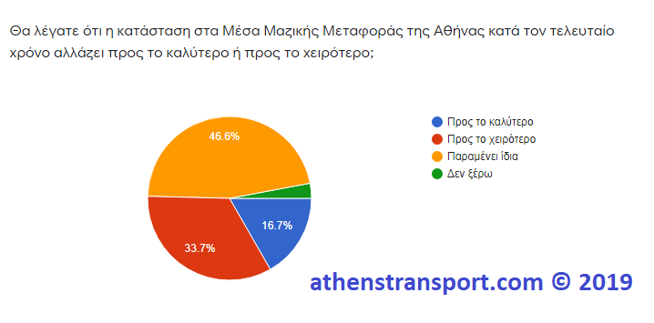 Το 46,6% όσων απάντησαν πιστεύουν πως η κατάσταση στα Μέσα Μαζικής Μεταφοράς της Αθήνας παραμένει η ίδια τον τελευταίο χρόνο (από 35,3% πέρυσι). Το 33,7% πιστεύει πως η κατάσταση οδεύει προς το χειρότερο, όταν πέρυσι αυτή ήταν η κυρίαρχη άποψη με 37,1%, ενώ το 16,7% πιστεύει πως η κατάσταση αλλάζει προς το καλύτερο (από 24% πέρυσι).