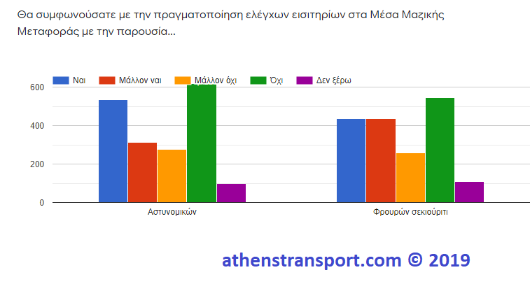 Διχασμένες είναι οι γνώμες για την παρουσία ή μη αστυνομικών ή φρουρών σεκιούριτι σε ελέγχους εισιτηρίων. To 48,6% (από 55,6% πέρυσι) θα διαφωνούσε ή μάλλον θα διαφωνούσε με την πραγματοποίηση ελέγχων εισιτηρίων στα Μέσα Μαζικής Μεταφοράς με την παρουσία αστυνομικών. ενώ το 46% θα συμφωνούσε (από 40,5% πέρυσι).