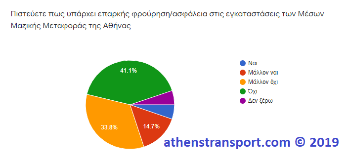 Η πλειοψηφία (74,9% από 77,5% πέρυσι) πιστεύει πως δεν υπάρχει ή μάλλον δεν υπάρχει επαρκής φρούρηση/ασφάλεια στις εγκαταστάσεις των Μέσων Μαζικής Μεταφοράς της Αθήνας. Αντίθετη άποψη έχει το 20% ενώ το 5,2% δεν ξέρει.