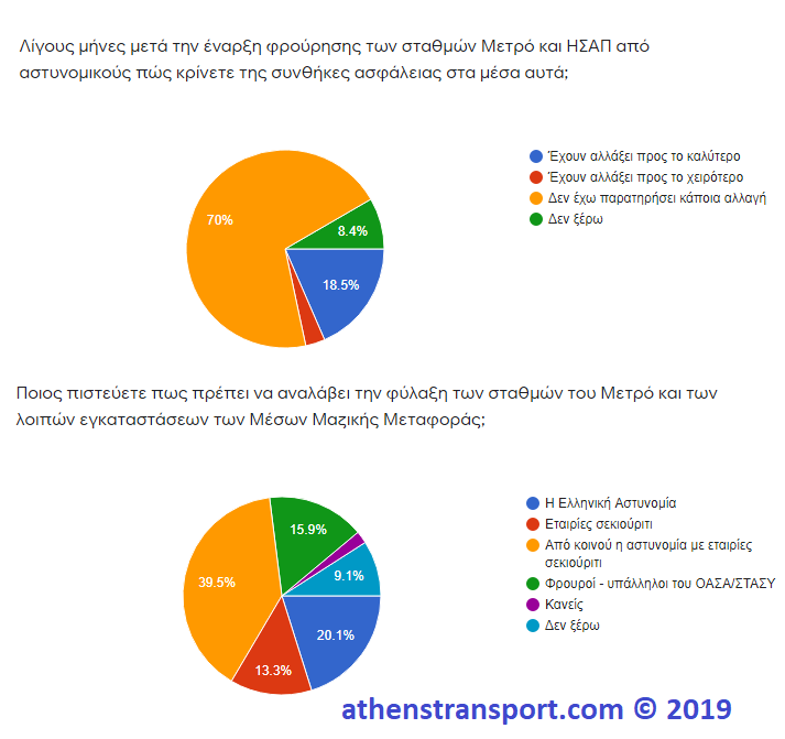 Η πλειοψηφία (39,5%) πιστεύει πως τη φύλαξη των σταθμών του Μετρό και των λοιπών εγκαταστάσεων των Μέσων Μαζικής Μεταφοράς πρέπει να την αναλάβει από κοινού η αστυνομία με τις εταιρείες σεκιούριτι. Το 20,1% πιστεύει πως την ασφάλεια πρέπει να την αναλάβει η Ελληνική Αστυνομία (από 16,9% πέρυσι), το 15,9% (από 18,5% πέρυσι) φρουροί – υπάλληλοι της ΣΤΑΣΥ, το 13,3% οι εταιρείες σεκιούριτι, το 2% κανείς ενώ το 9,1% δεν ξέρει.