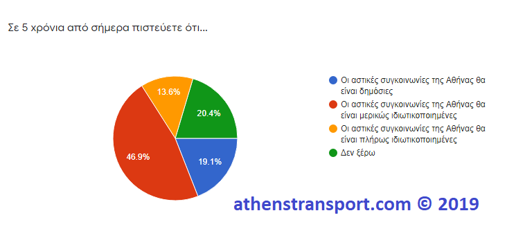 Ερωτώμενοι για το πώς πιστεύουν ότι θα εξελιχθεί η κατάσταση σε 5 χρόνια από σήμερα, το 46,9% πιστεύει πως τα Μέσα Μαζικής Μεταφοράς της Αθήνας θα έχουν μερικώς ιδιωτικοποιηθεί, ενώ το 13,6% (από 20,5% πέρυσι) πιστεύει πως θα έχουν πλήρως ιδιωτικοποιηθεί. Το 19,1% (από 11,6% πέρυσι) πιστεύει πως θα παραμένουν δημόσια και το 20,4% απάντησε πως δεν ξέρει.