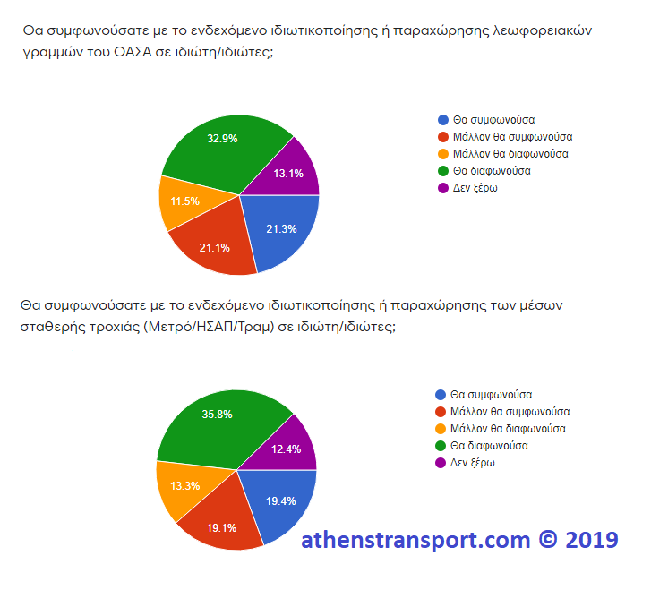 To 44,4% θα διαφωνούσε ή μάλλον θα διαφωνούσε με το ενδεχόμενο ιδιωτικοποίησης ή παραχώρησης περισσότερων λεωφορειακών γραμμών του ΟΑΣΑ σε ιδιώτη/ιδιώτες. Το 34,4% (από 36,3% πέρυσι) θα συμφωνούσε ή μάλλον θα συμφωνούσε ενώ το 13,1% απαντά πως δεν γνωρίζει.