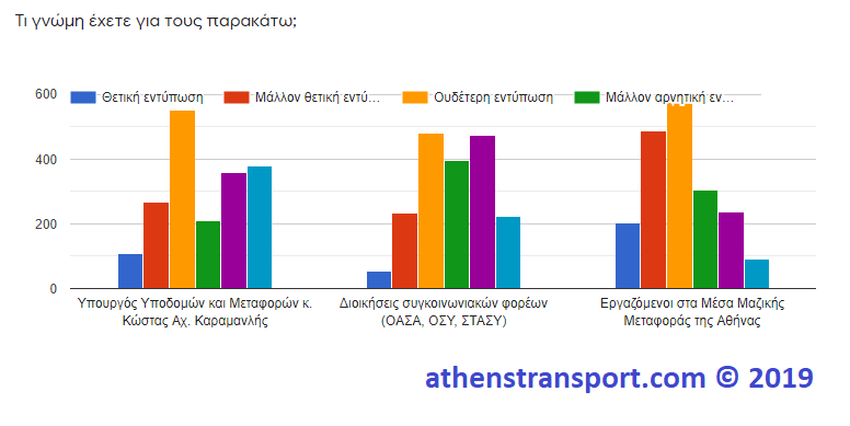 Το 46,8% έχει αρνητική ή μάλλον αρνητική γνώμη και για τις διοικήσεις των συγκοινωνιακών φορέων (ΟΑΣΑ, ΟΣΥ, ΣΤΑΣΥ). Το 25,8% έχει ουδέτερη γνώμη ενώ το 15,5% έχει θετική ή μάλλον θετική γνώμη.