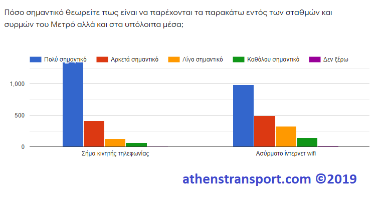 Το 68,9% θεωρεί ως πολύ σημαντικό να παρέχεται σήμα κινητής τηλεφωνίας εντός των σταθμών και συρμών του Μετρό. Το 21,5% το θεωρεί αρκετά σημαντικό, το 6,7% λίγο σημαντικό και το 3,2% καθόλου σημαντικό.