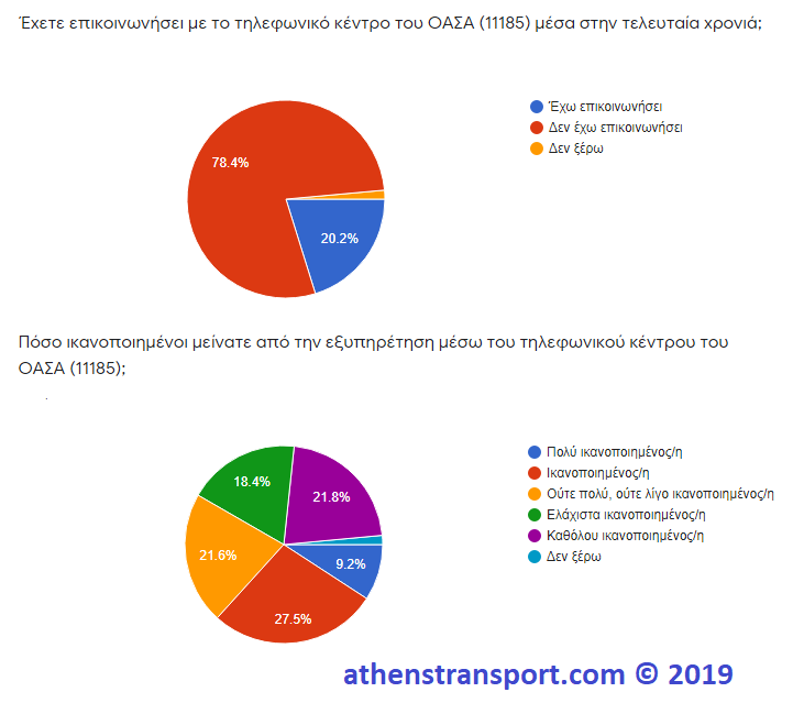 Τέλος, οι συμμετέχοντες στην έρευνα ερωτήθηκαν για το εάν έχουν χρησιμοποιήσει το τηλεφωνικό κέντρο του ΟΑΣΑ (11185). Το 78,4% απάντησε πως δεν έχει επικοινωνήσει με το τηλεφωνικό κέντρο ενώ το 20,2% (από 23,6% πέρυσι) απάντησε πως έχει επικοινωνήσει.