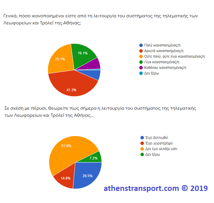 Όσοι δήλωσαν επιβάτες των Λεωφορείων και Τρόλεϊ, ρωτήθηκαν για το σύστημα της τηλεματικής. Το 41,3% (από 46,3% πέρυσι) δηλώνουν αρκετά ικανοποιημένοι. Το 25,1% ούτε πολύ ούτε λίγο ικανοποιημένοι ενώ το 19,1% από 13,7% πέρυσι) λίγο ικανοποιημένοι. Καθόλου ικανοποιημένοι είναι το 7,2% (από 5,1% πέρυσι) ενώ πολύ ικανοποιημένοι μόνο το 6,5% (από 11,2% πέρυσι).