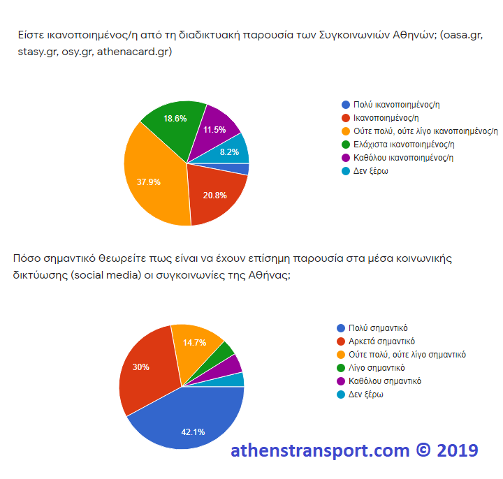 Το 37,9% όσων απάντησαν δηλώνουν ούτε πολύ ούτε λίγο ικανοποιημένοι από τη διαδικτυακή παρουσία των συγκοινωνιακών φορέων (oasa.gr, stasy.gr, osy.gr, athenacard.gr). Το 30,1 δηλώνουν ελάχιστα ή καθόλου ικανοποιημένοι (από 26% πέρυσι) και μόνο το 23,9% δηλώνουν αρκετά ή πολύ ικανοποιημένοι (από 31,5% πέρυσι).