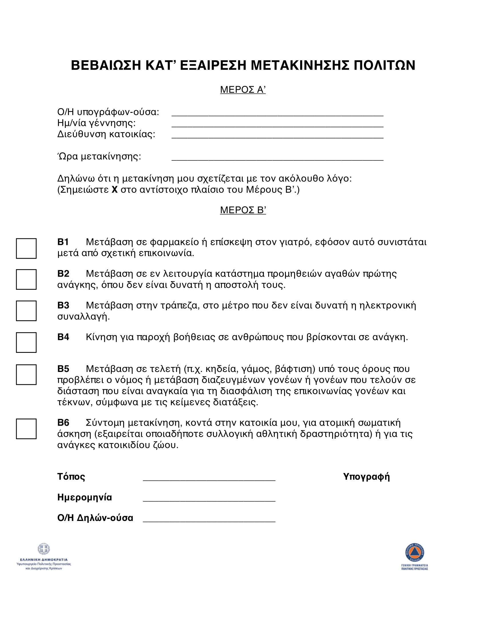 Για όλες τις άλλες μετακινήσεις, η βεβαίωση κίνησης αφορά κάθε μεμονωμένη κίνηση και μόνο αυτή (τύπου Β), υπογράφεται από τον ίδιο τον ενδιαφερόμενο με προσωπική του ευθύνη και περιέχει το ονοματεπώνυμο, την ημερομηνία γέννησης, την διεύθυνση κατοικίας και την ώρα μετακίνησης του πολίτη, καθώς και τον συγκεκριμένο λόγο της μετακίνησης.