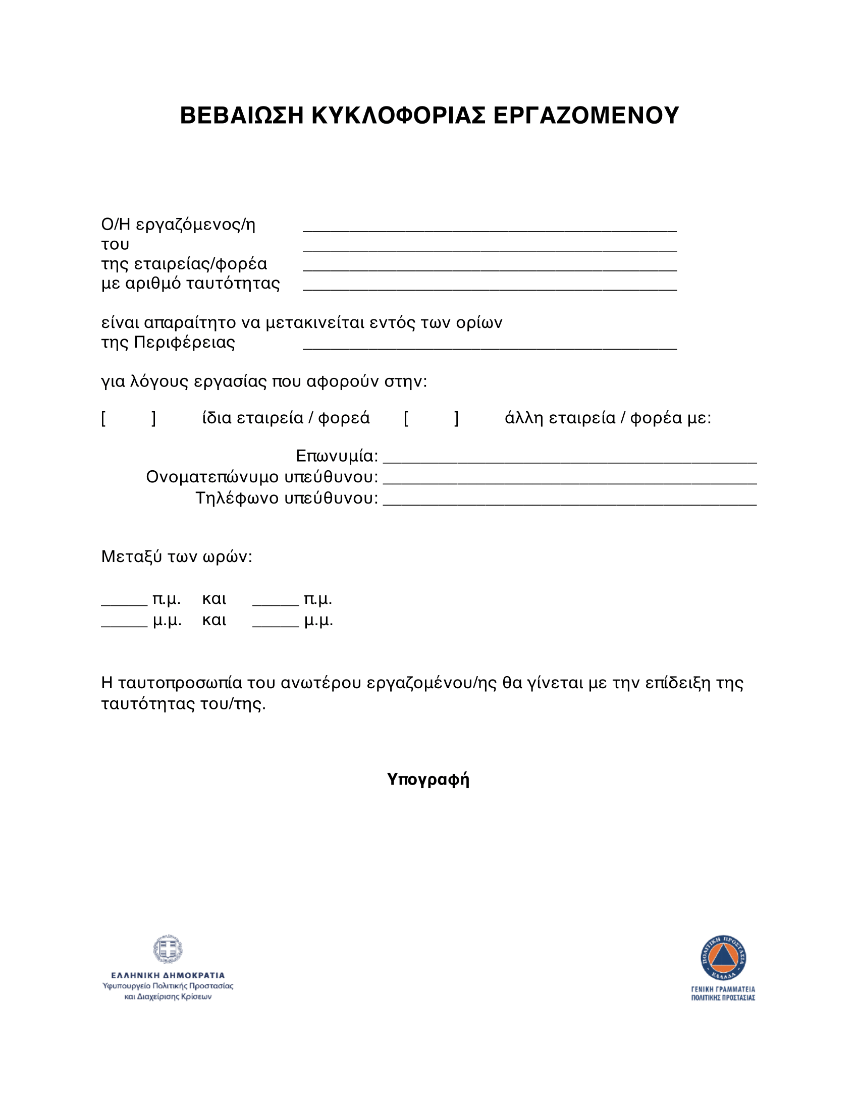 Για μετάβαση προς και από την εργασία κατά τις εργάσιμες ώρες, η βεβαίωση κίνησης είναι πάγια (τύπου Α) και παρέχεται με προσωπική ευθύνη του υπογράφοντος από τον εργοδότη ή τον νόμιμο εκπρόσωπό του σε περίπτωση νομικού προσώπου ή, σε περίπτωση ελεύθερου επαγγελματία ή αυτοαπασχολούμενου.