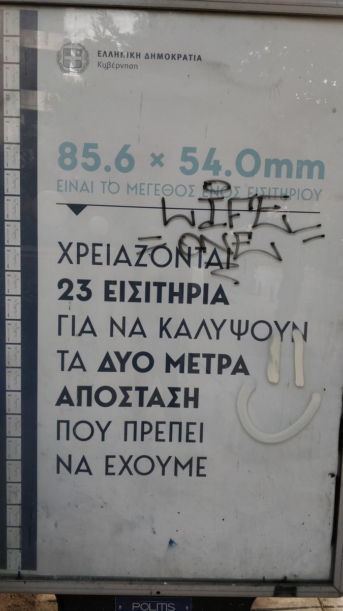 Να κρατάμε απόσταση 23 εισιτηρίων μας προτείνει η διαφήμιση με την υπογραφή “Ελληνική Δημοκρατία” που έχει τοποθετηθεί σε στάσεις λεωφορείων η οποία επίσης για κάποιο λόγο μας ενημερώνει και για τις διαστάσεις του εισιτηρίου σε χιλιοστά. Σίγουρα δεν θα πρόκειται για την καλύτερη δουλειά του διαφημιστή που μάλλον είχε πιεστικό deadline για να παραδώσει το κείμενό του. Υπάρχει άραγε κανείς που θεωρεί το “απόσταση 23 εισιτηρίων” πιο ευκολονόητο από το “απόσταση 2 μέτρων”;