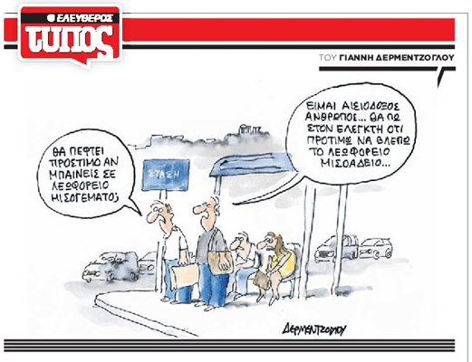 Προκαλεί απορία πάντως ότι ενώ τη μία μέρα ο κ. Καραμανλής δηλώνει πως θα εξακολουθούν να υπάρχουν φαινόμενα συνωστισμού στις συγκοινωνίες της Αθήνας λόγω της κατάστασης στην οποία βρίσκονται, την επόμενη μέρα υπογράφει απόφαση σύμφωνα με την οποία τόσο οι επιβάτες όσο βέβαια και οι εργαζόμενοι βρίσκονται υπό την απειλή προστίμου αν πρέπει να χρησιμοποιήσουν τα μέσα.