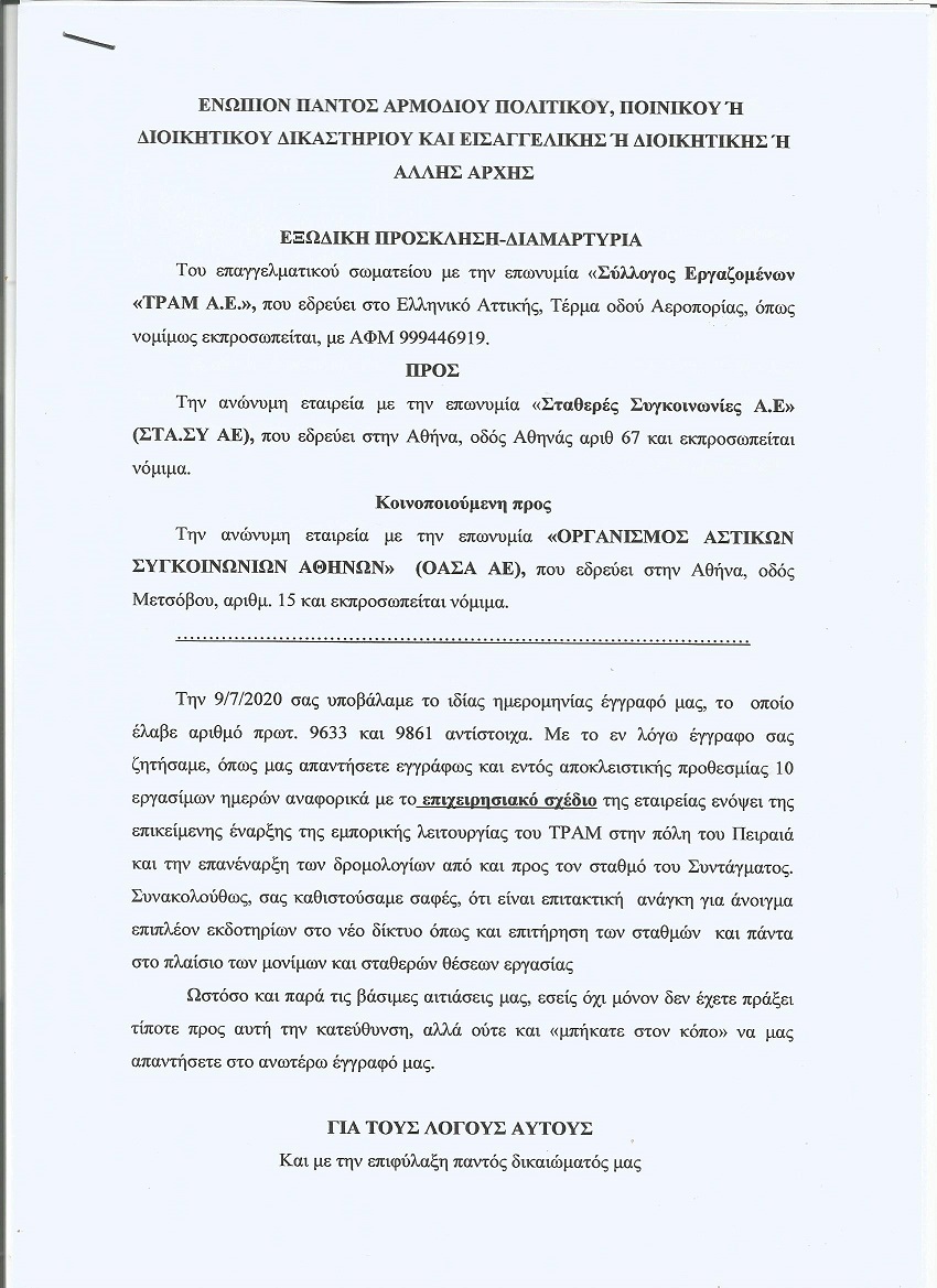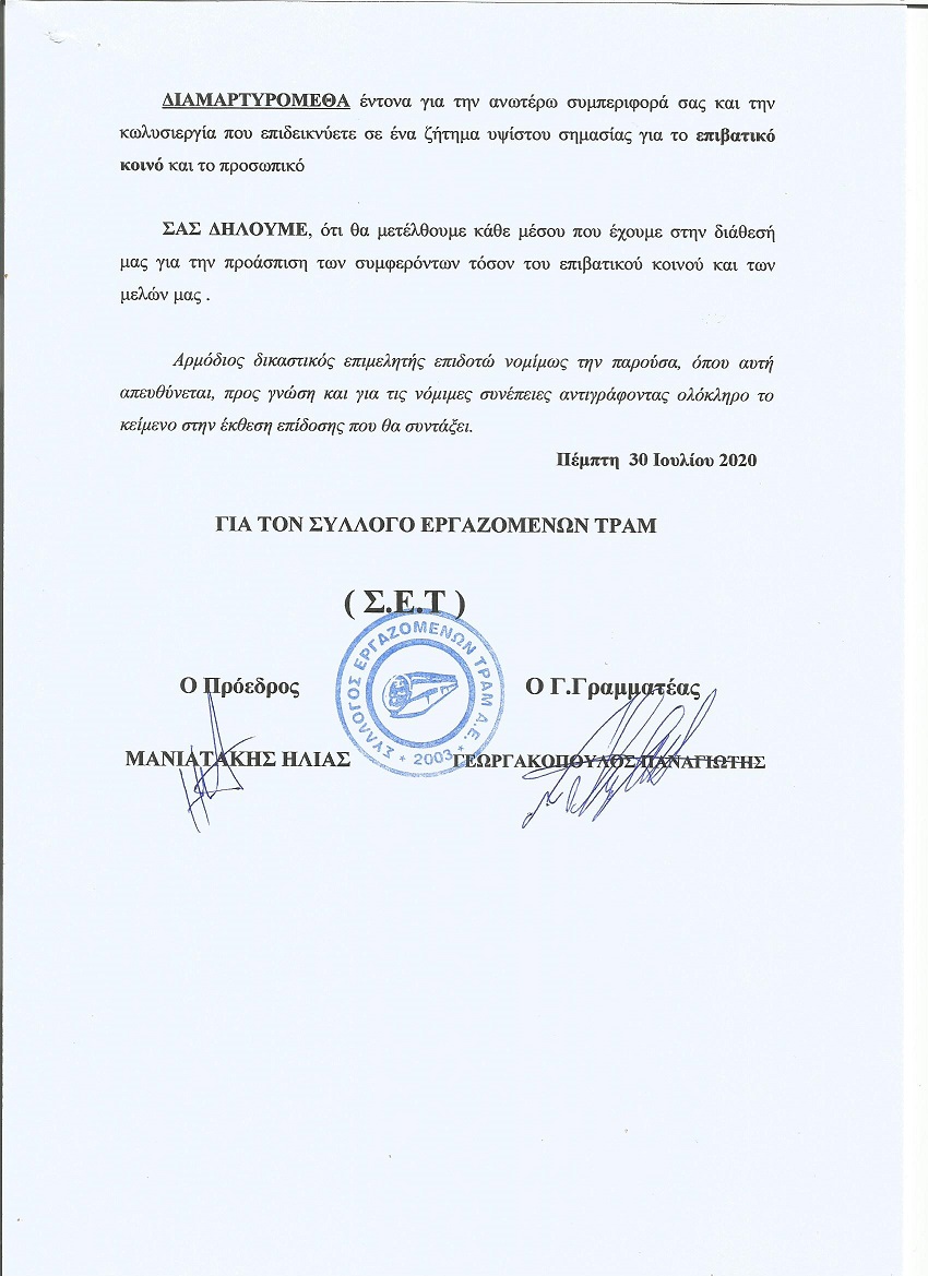 Εξώδικο από το Σύλλογο Εργαζομένων Τραμ για την παράδοση των τμημάτων προς Σύνταγμα και Πειραιά και τα εκδοτήρια εισιτηρίων