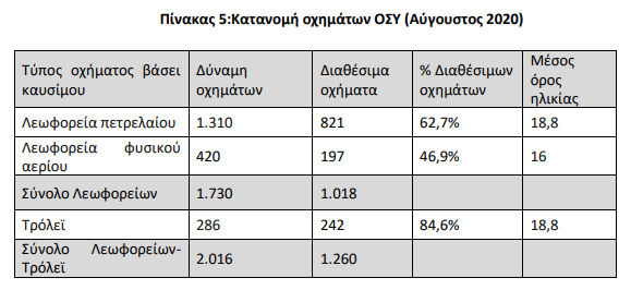 Ενδιαφέρον παρουσιάζουν τα στοιχεία και για τον Αύγουστο του 2020 οπότε και το σύνολο των διαθέσιμων λεωφορείων έφτανε τα 1.018. Σημειώνεται ότι το συγκεκριμένο μήνα, με απόφαση του πρωθυπουργού αποφασίστηκε να ανακληθούν οι άδειες των οδηγών και να μην ισχύει το πρόγραμμα δρομολογίων θερινό ΙΙ λόγω των φαινομένων συνωστισμού που παρατηρήθηκαν στα μέσα.