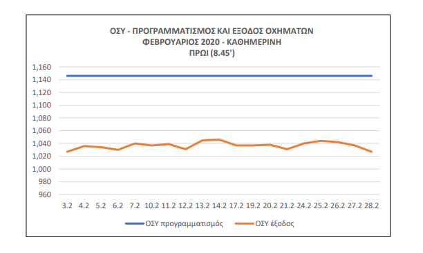 Από τα προγραμματισμένα οχήματα προς κυκλοφορία, τα οχήματα που τελικά εξέρχονται από τα αμαξοστάσια της ΟΣΥ για την εκτέλεση του έργου ανέρχονται σε 1.037 (911 θερμικά λεωφορεία και 125 τρόλεϊ), όπως παρουσιάζεται στον παρακάτω πίνακα. Ως εκ τούτου προκύπτει ότι στις ώρες πρωινής αιχμής, την τυπική καθημερινή, 106 θερμικά λεωφορεία του στόλου οχημάτων υπολείπονται του προγραμματισμένου αριθμού οχημάτων ΟΣΥ, λόγω μη διαθεσιμότητας οδηγών και οχημάτων.