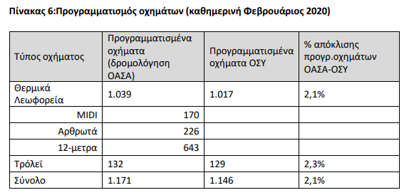 Ο ΟΑΣΑ προγραμματίζει την τυπική καθημερινή ημέρα (Φεβρουάριος 2020), τη δρομολόγηση 1.039 θερμικών λεωφορείων και 132 τρόλεϊ. Η ΟΣΥ λαμβάνοντας υπόψη το πρόγραμμα δρομολόγησης του ΟΑΣΑ προγραμματίζει την κυκλοφορία 1.017 θερμικών λεωφορείων και 129 τρόλεϊ κατά την πρωινή αιχμή. Η απόκλιση μεταξύ των προγραμματισμένων οχημάτων ΟΑΣΑ και ΟΣΥ ανέρχεται σε 2,1% για τα λεωφορεία και 2,3% για τα τρόλεϊ.