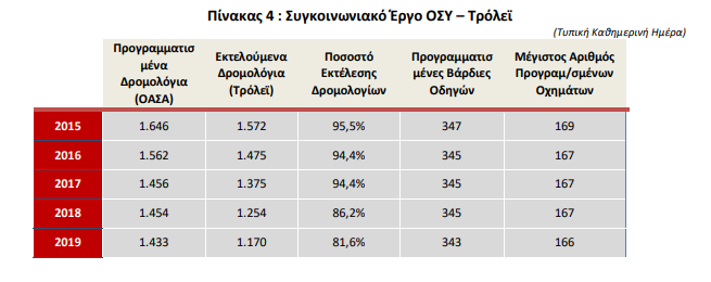 Όσον αφορά τα Τρόλεϊ, παρατηρούμε μία σχετικά μικρή μείωση στον αριθμό των οχημάτων (από 169 σε 166) και τις προγραμματισμένες βάρδιες οδηγών από 347 σε 343) από το 2015 ως το 2019, αλλά σημαντική μείωση ως προς τον αριθμό των εκτελούμενων δρομολογίων (από 1.572 σε 1.170) και το ποσοστό εκτέλεσης δρομολογίων (από 95,5% σε 81,6%).