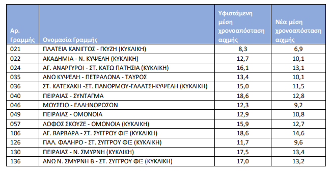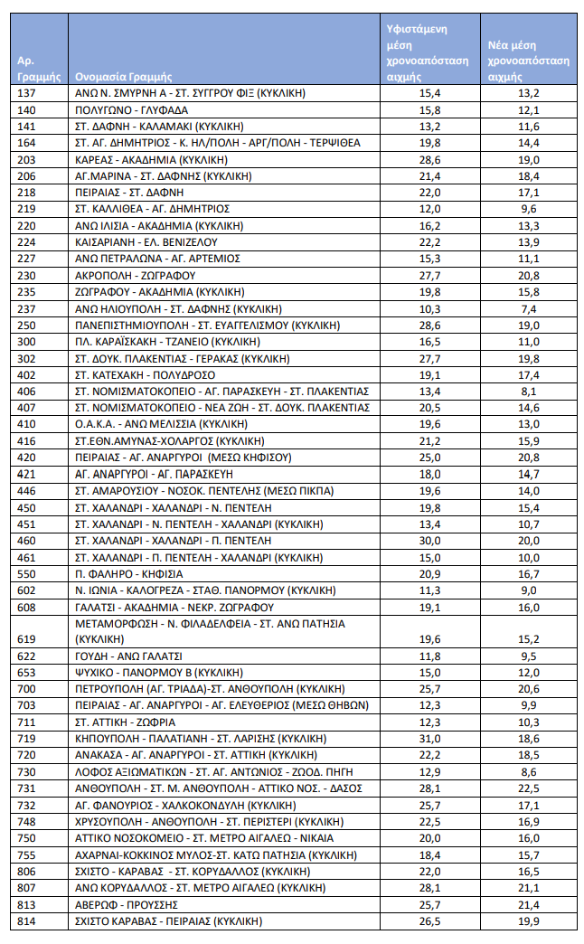 Από τις 104 αυτές γραμμές, 11 θα έχουν μέση χρονοαπόσταση κατά τις ώρες αιχμής έως και 10 λεπτά (προηγουμένως μία, αύξηση 10%), 58 θα έχουν χρονοαπόσταση από 10 έως και 20 λεπτά (προηγουμένως 43, αύξηση 15%), 28 θα έχουν χρονοαπόσταση από 20 έως και 30 λεπτά (προηγουμένως 33, μείωση 5%), και 6 γραμμές θα έχουν μέση χρονοαπόσταση κατά τις ώρες αιχμής μεγαλύτερη των 30 λεπτών (προηγουμένως 27 γραμμές, μείωση 21%).