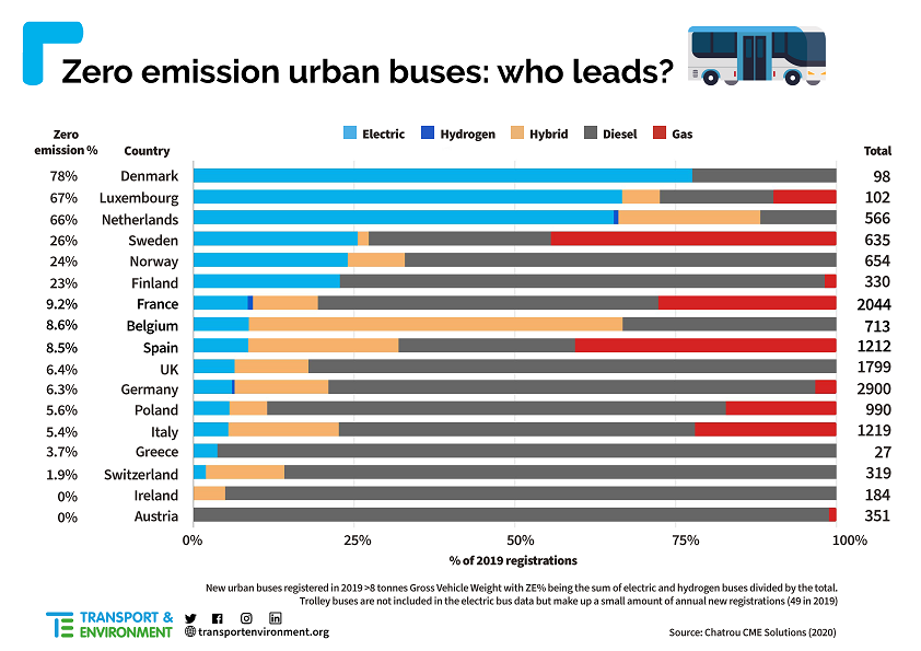 Οι χώρες όμως που αγόρασαν το 70% των λεωφορείων (Ιταλία, Πολωνία, Γερμανία, Ηνωμένο Βασίλειο, Ισπανία και Γαλλία) βρίσκονται αρκετά πίσω. Το 2019, μόνο το 10% των λεωφορείων που ταξινομήθηκαν ήταν ηλεκτρικά ή υδρογόνου. Παρόλα αυτά, έχουν συμβεί και θετικά βήματα, με τη γερμανική κυβέρνηση να χρηματοδοτεί από το 2020 το 80% του κόστους αγοράς ηλεκτρικών λεωφορείων και την Πολωνία να ανακοινώνει πως από το 2030, σε όλες οι πόλεις με πληθυσμό άνω των 100.000 κατοίκων το σύνολο των αστικών λεωφορείων πρέπει να είναι ηλεκτρικά.